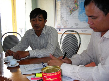 Ông Lê Chí Thanh (trái) - Chủ tịch UBND xã Hoằng Khánh trao đổi với báo chí.