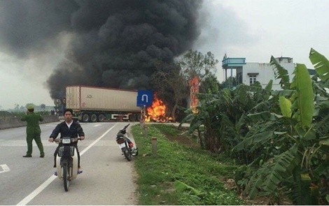 Sau khi đối đầu, hai ôtô tiếp tục đâm vào một nhà dân ven đường mới dừng lại. Cú đâm mạnh khiến chiếc ôtô khách phát hỏa. Người dân tại khu vực gần đó phải dùng phương tiện tại chỗ để dập lửa nhưng bất thành. Chỉ trong ít phút, ngọn lửa bao trùm xe khách, lan sang phần đầu xe container.