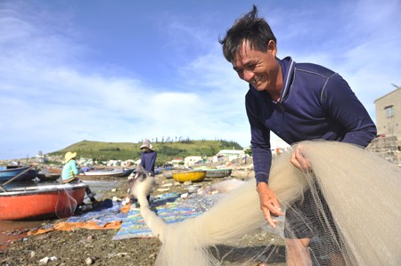 Ngư dân Lý Sơn chuẩn bị lưới ra khơi.