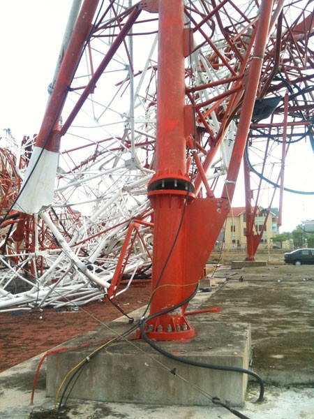 Đế móng không sụt lún, tháp đã bị gãy ở vị trí cách mặt đất khoảng 20m - Ảnh: Hoàng Long
