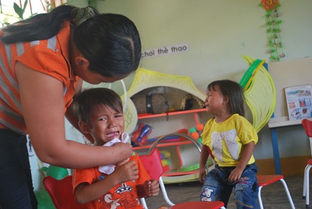 Giáo viên Trường mầm non Hoa Phượng, xã Trà Đốc dỗ các cháu sau một trận động đất.