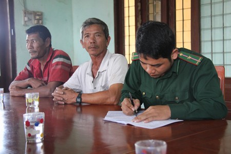 Cán bộ Biên phòng Trạm Tịnh Kỳ (Quảng Ngãi) đang tiếp nhận trình báo của ngư dân bị cướp tài sản.