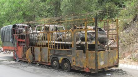 8 giờ 30 phút sáng 26/6, tại Km12+700 thuộc địa phận dốc Miếu, xã Hương Hồ, thị xã Hương Trà đã xảy ra vụ cháy xe đầu kéo rơ-moóc làm 6 xe ô tô mới hiệu Huyndai bị thiêu rụi.