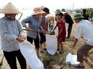 Đắp tuyến kè biển bị sạt lở do bão. (Ảnh: Công Tường/TTXVN)
