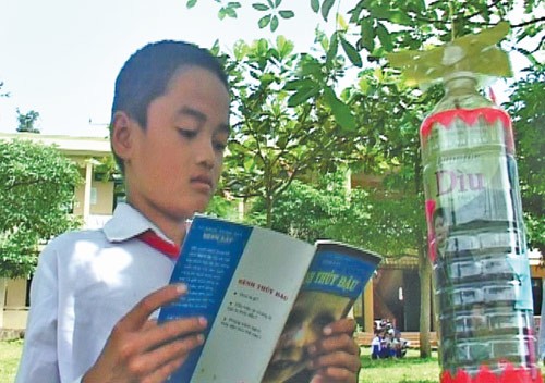 “Để gầy dựng thư viện, chúng tôi tận dụng những vỏ chai nhựa, sau khi trang trí thật bắt mắt thì cuộn tròn sách vào chai và treo trên cây. Các em học sinh của chúng tôi vốn rất nhút nhát nhưng được đọc sách trong một không gian hoàn toàn thiên nhiên này chẳng em nào có thể cưỡng lại. Giờ chúng tôi chẳng cần phải nhắc, cứ đến giờ nghỉ là các em lại ra gốc cây, hái sách, vừa hóng mát vừa đọc cho nhau nghe…”, Tứ giải thích thêm.