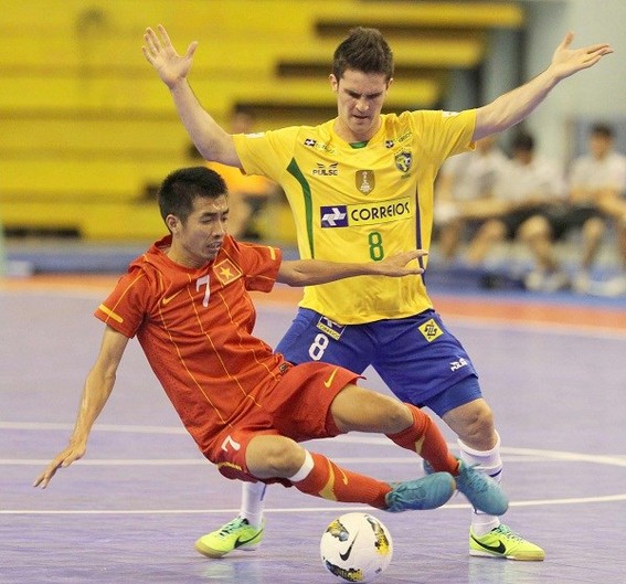 Đội tuyển Futsal Việt Nam (áo đỏ) đã tạo nên bất ngờ thú vị trước Brazil.