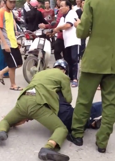 Được biết, hai chiến sĩ công an truy đuổi một nam thanh niên đi xe máy không đội mũ bảo hiểm. Sau đó, không rõ vì nguyên nhân gì, một chiến sĩ công an đã vật lộn với thanh niên trên, chiến sĩ còn lại đứng ngay bên cạnh gọi điện thoại cho người đến xử lý.