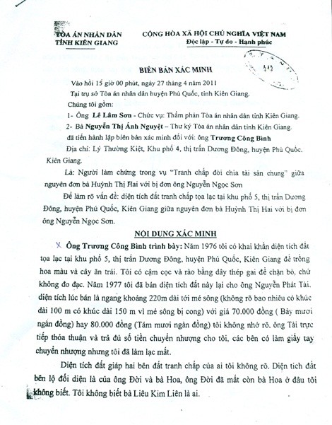 Tuy nhiên, 27/4/2011, tại Trụ sở TAND huyện Phú Quốc, Kiên Giang, ông Trương Công Bình cũng đã làm biên bản xác minh rõ: “Năm 1977, tôi bán thửa đất cho ông Nguyễn Phát Tài (cha ông Sơn) với diện tích ngang khoảng 220m dài tới mé sông (không rõ bao nhiêu, có khúc dài 100m có khúc 150m vì mé sông bị cong) với giá 70.000 đồng hay 80.000 đồng tôi không nhớ rõ. Ông Tài trực tiếp thỏa thuận và trả đủ số tiền chuyển nhượng cho tôi, các bên làm giấy tay chuyển nhượng nhưng tôi đã làm lạc mất”.