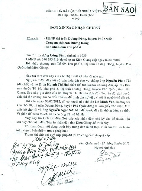 Ông Bình cũng đã làm đơn xác nhận chữ ký để đối chứng với giấy chứng nhận bán đất mà ông Sơn có