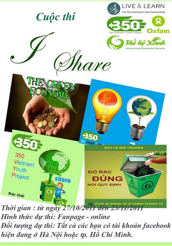 Đó là cuộc thi I SHARE (chia sẻ ý tưởng và kinh nghiệm bảo vệ môi trường) trên facebook do Câu lạc bộ 350VYP tổ chức. Cuộc thi triển khai dưới hình thức diễn đàn trao đổi, không phân biệt lứa tuổi. Các bạn muốn tham gia chỉ cần truy cập vào facebook của chương trình, like fanpage và post bài dự thi tại mục Thảo luận bằng cách tạo một chủ đề mới. Tên chủ đề là tên bài viết và tên trên facebook của bạn, nội dung chủ đề là đường link đến bài viết của bạn và bất cứ điều gì bạn muốn chia sẻ thêm.