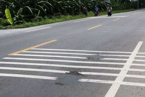Dự án quốc lộ 1 đoạn đường tránh Cai Lậy và tăng cường mặt đường đoạn Km 1987 + 560 với tổng số vốn đầu tư hơn 1.300 tỷ đồng mới đưa vào sử dụng nhưng đã hư hỏng. Ảnh: Văn Dũng