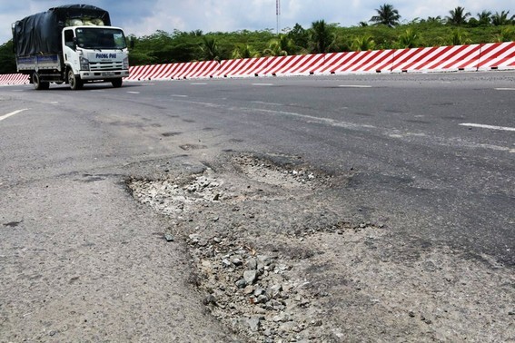 Đại diện nhà đầu tư BOT Cai Lậy nói rằng nguyên nhân dẫn đến tình trạng hư hỏng như do thời tiết, do nhiều xe chạy trên tuyến quốc lộ hiện nay không đúng tải trọng. Ảnh: Văn Dũng