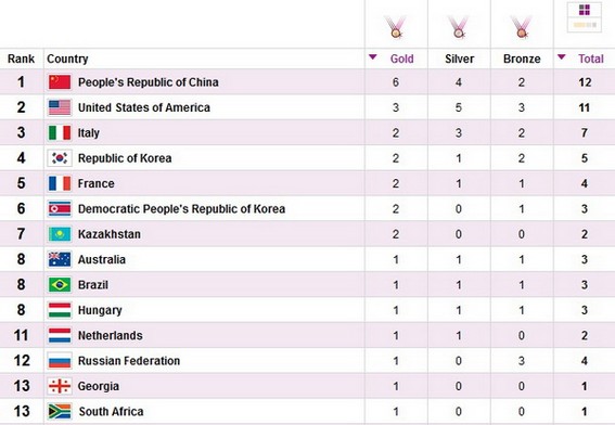 Trung Quốc đang dẫn đầu cả về số HCV lẫn tổng số huy chương các loại. Có 30 đoàn đã giành được huy chương trong đó có 14 đoàn đã giành được ít nhất 1 HCV sau 2 ngày thi đấu của Olympic London. Các đoàn xếp sau Trung Quốc trên bảng tổng sắp huy chương theo thứ tự là Mỹ (2), Italia (3), Hàn Quốc (4), Pháp (5), CHDCNDTT (6), Kazakhstan (7), Australia (8), Brazil (9), Hungary (10), Hà Lan (11), Nga (12), Georgia (12), Nam Phi (13)…