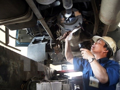 Nhân viên đăng kiểm tiến hành kiểm định phương tiện. (Ảnh: Hoàng Hùng/TTXVN)