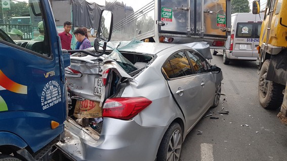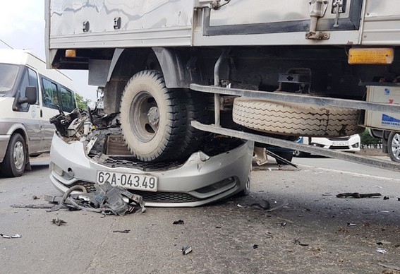 Cụ thể, chiếc xe tông vào đuôi ô tô 4 chỗ BKS 62A - 043.49 do tài xế Nguyễn Thành Lập (39 tuổi, quê Long An) cầm lái rồi đẩy phương tiện này đâm vào đuôi chiếc xe tải BKS 51C-087.92 do tài xế Trần Anh Tài (37 tuổi, ngụ quận Tân Phú) điều khiển.