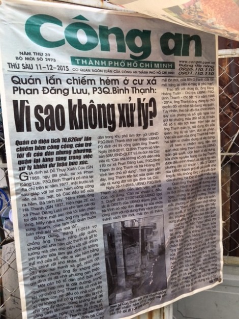 ĐS&TD - Theo đơn tố cáo của bà Đỗ Thụy Xuân Cúc (ngụ nhà 9B phải Phan Đăng Lưu, phường 3, quận Bình Thạnh, TPHCM) gửi Báo Đời Sống và Tiêu Dùng(ĐSTD) tố cáo ông Hà Thanh - bố bà Hà Thị Vân, Chủ tịch UBND phường 19 quận Bình Thạnh – xây công trình lấn chiếm hẻm công cộng tại lô B cư xá Phan Đăng Lưu, phường 3, quận Bình Thạnh.