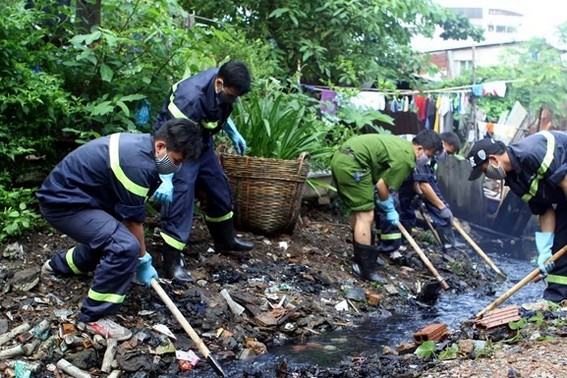 Ra quân thu dọn vệ sinh, khơi thông kênh rạch Cầu Dừa tại Quận 4, Thành phố Hồ Chí Minh. (Ảnh: Thanh Vũ/TTXVN)