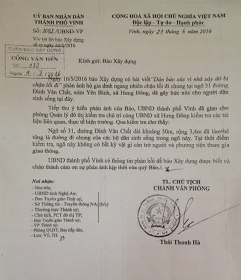 Công văn số 3092/UBND-VP của UBND TP Vinh trả lời sự việc Báo Xây dựng phản ánh.