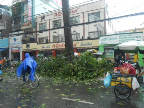 Khi đến trước số nhà 480 đường Nguyễn Thị Minh Khai, phường 2, quận 3, TPHCM thì một nhánh cây cổ thụ có bán kính gần 40cm gãy đổ xuống đè lên phần đầu chiếc xe.