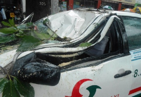 Tài xế chở ba hành khách đang lưu thông ngon trớn trên đường thì bất ngờ một nhánh cây xanh bên đường gãy xuống khiến đầu chiếc taxi biến dạng.