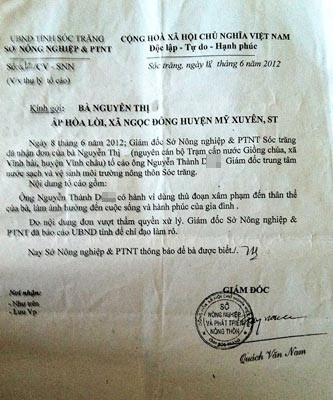 Văn bản trả lời đơn của Giám đốc Sở NN&PTNT tỉnh Sóc Trăng.