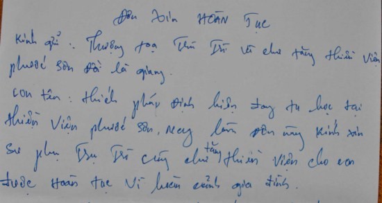 Trong những năm tháng qua, mặc dù đã được sư phụ ân cần dạy bảo lời hay lẽ phải của đạo lý nhà Phật, nhưng con còn trẻ người non dạ, suy nghĩ cạn cợt nên đã có những cử chỉ, lời nói, suy nghĩ chưa chuẩn mực với tư cách của người xuất gia, làm đau lòng sư phụ và tăng chúng thiền viện, làm ảnh hưởng đến giáo hội và quý tăng ni chân tu khác, làm suy giảm tín tâm của phật tử và của những người yêu mến đạo Phật.