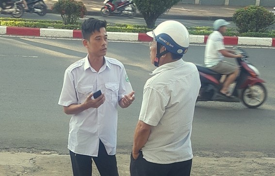 Tài xế xe taxi (áo trắng, bên trái) đến trình diện tại hiện trường
