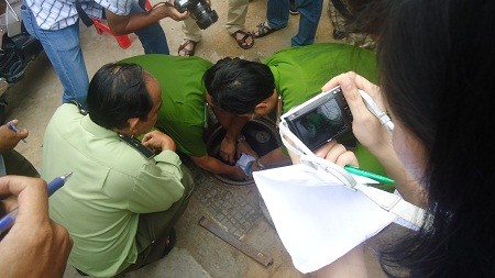 Đội cảnh sát điều tra tội phạm về trật tự quản lý kinh tế chức vụ (Công an Q.Bình Thạnh) đang lấy mẫu xăng tại trạm xăng Lan Anh đưa đi phân tích.