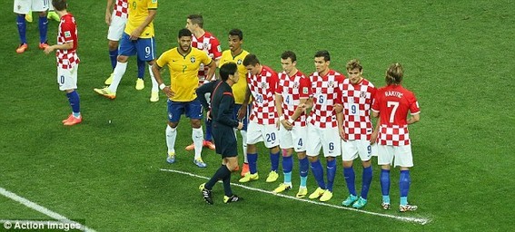 Trong một pha tổ chức đá phạt của các cầu thủ Brazil, trọng tài chính người Nhật Bản Yuichi Nishimura đã sử dụng một lọ sơn xịt màu trắng để... kẻ vạch nhằm cảnh báo các các cầu thủ Croatia không được lấn quá đà.