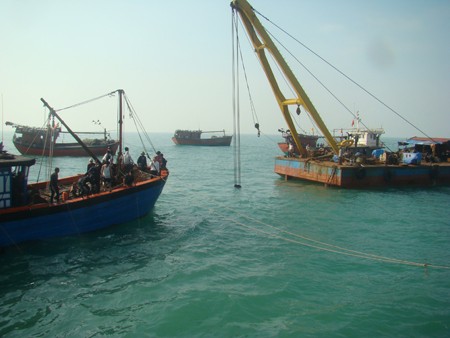 Hiện trường trục vớt tàu cá QB 93714 TS chiều 2.1.