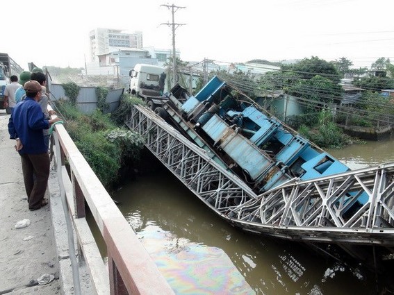 Do phương tiện xe tải làm sập 2 nhịp cầu cuối hướng về Trà Vinh, một phần thân xe nằm trên trên thân cầu rơi xuống sông, vị trí phức tạp nên đơn vị trục vớt phải sử dụng 2 sà lan cẩu và sà lan vận chuyển tiếp cận phương tiện.