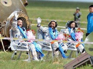 Ba nhà du hành vũ trụ sau khi tàu Thần Châu hạ cánh. Ảnh: THX/TTXVN