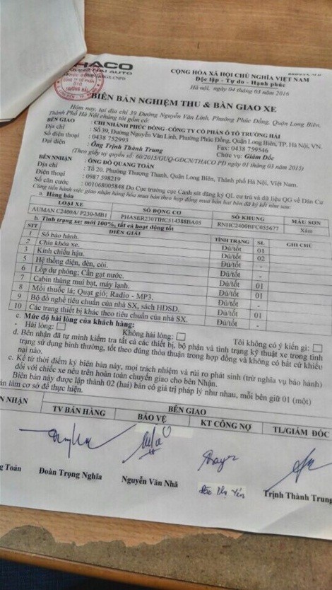 Biên bản nghiệm thu bàn giao xe từ Trường Hải cho anh Toản