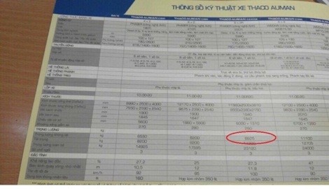 Theo đó, ngày 6/8 anh Toản có qua Thaco - chi nhánh Phúc Đồng tại 39 Nguyễn Văn Linh, P. Phúc Đồng, Long Biên để mua xe Auman C24000A/P230-MB1, giá trị xe 875 triệu. Khi giao nhận xe, anh Nghĩa - nhân viên kinh doanh Trường Hải có giới thiệu kèm catalog về thông số kỹ thuật xe. Trong đó, trọng lượng không tải là 8625kg.