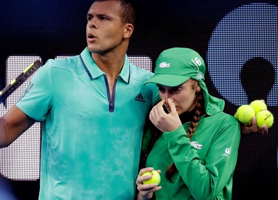 Thậm chí, Tsonga còn tận tình dìu cô gái nhặt bóng này ra khỏi sân để nhận sự chăm sóc của các nhân viên y tế.