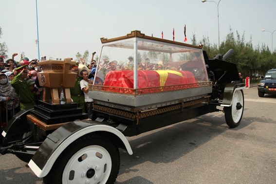 Trước đó, chuyên cơ mang mã hiệu VN103 đã hạ cánh xuống sân bay Đồng Hới (Quảng Bình) lúc 11h50 phút. Trong lễ đón Đại tướng sân bay có Chủ tịch nước Trương Tấn Sang, Trưởng ban tổ chức lễ tang - Phó thủ tướng Nguyễn Xuân Phúc cùng gia quyến và quan khách.