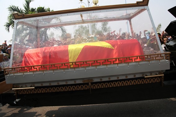 Linh cữu được đặt trên linh xa phủ lá cờ của dân tộc