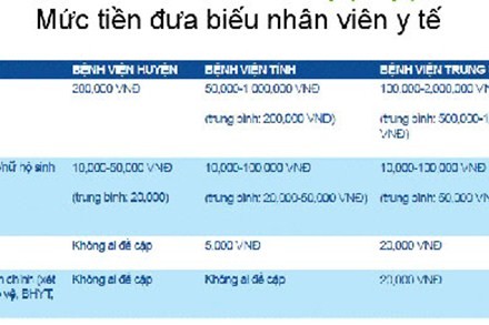 Bản thống kê mức tiền đưa biếu nhân viên y tế (ảnh chụp lại từ tài liệu: Chi phí không chính thức trong dịch vụ y tế: Thực trạng và giải pháp của Tổ chức Hướng tới minh bạch).