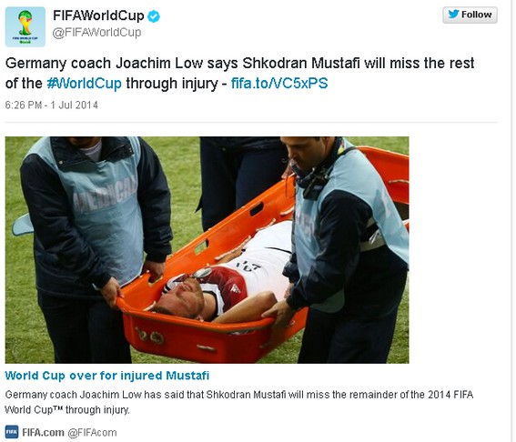 Ngay trước trận đấu với Pháp ở tứ kết World Cup 2014, tuyển Đức đã nhận tin không vui khi hậu vệ Shkodran Mustafi phải sớm nói lời chia tay ngày hội bóng đá lớn nhất hành tinh vì gặp chấn thương nặng trong trận đấu với Algeria.