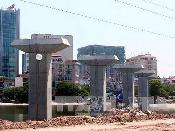 Một đoạn trụ đỡ đường sắt trên cao, đoạn qua hồ Đống Đa, của dự án tuyến đường sắt đô thị trên cao Cát Linh-Hà Đông. (Ảnh: Huy Hùng/TTXVN)