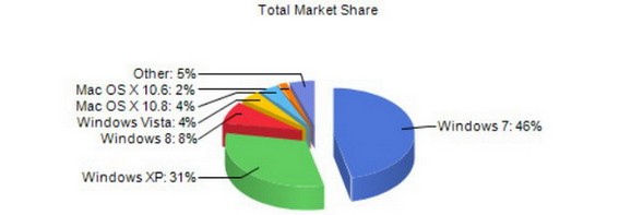 Ngoài ra, theo Net Applications thì hệ điều hành phổ biến một thời là Windows XP tiếp tục sụt giảm thị phần từ 33,66% xuống còn 31,41%. Dù vậy, tỷ lệ suy giảm của XP đã chậm lại so với hồi tháng trước.