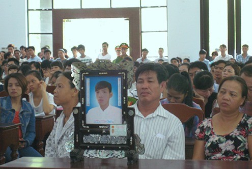 Gia đình bị hại mang di ảnh của con đến phiên tòa