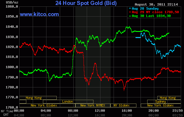 Giá vàng trên sàn Kitco tăng lên 1.834 USD/ounce do kỳ vọng Cục dự trữ Liên bang Mỹ Fed sẽ nới lỏng chính sách tiền tệ nhằm thúc đẩy nền kinh tế đang tăng trưởng chậm lại.