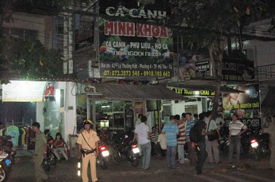 Khoảng 17 giờ 45 phút cùng ngày, người dân xung quanh cửa hàng cá cảnh Minh Khoa số 42A2 đường Lý Thường Kiệt, phường 4, TP.Mỹ Tho (Tiền Giang) thấy có hai thanh niên khoảng 20 tuổi, bước vào cửa hàng, nói chuyện với anh Võ Thái Nguyên Phong (16 tuổi, ngụ đường Trần Hưng Đạo, phường 4, TP.Mỹ Tho) là nhân viên của cửa hàng.