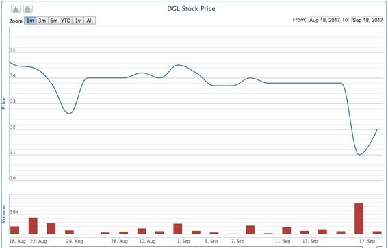 Một tháng nay, giá cổ phiếu DGL doa động quanh 33.000 - 34.000 đồng/cp. Trong phiên ngày 15/9, giá cổ phiếu bất ngờ giảm 8,3% về mức 31.000 đồng/cp. Kết phiên ngày 18/9, giá cổ phiếu DGL hồi phục lên 32.000 đồng/cp.