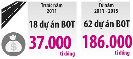 Trước năm 2011 chỉ 18 dự án BOT được triển khai, nhưng giai đoạn 2011 - 2015 có tới 62 dự án BOT giao thông được thực hiện.