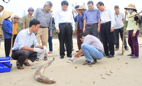 Cơ quan chức năng tỉnh Quảng Trị kiểm tra tình trạng cá chết ven biển. (Ảnh: Nguyễn Phúc)