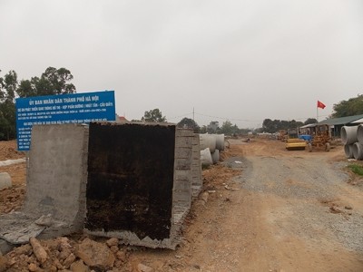 Thực tế, đường công vụ vào mặt bằng thi công tại cụm dân cư số 1 đã bị cắt đứt, một trong 3 đốt cống bắc qua mương bị cẩu gạt ra khỏi vị trí, đất đá vương vãi.