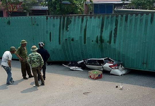 Chiếc xe container lật nghiêng đã đè bẹp chiếc xe Toyota Yaris màu trắng khiến 2 người tử vong.