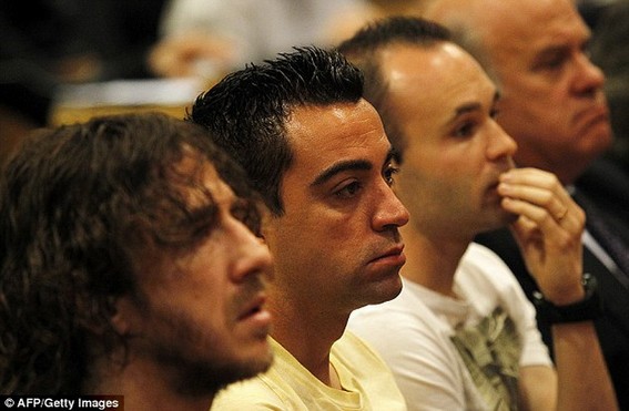 Các đồng đội ở Barca lắng nghe bài phát biểu của Valdes. Nguồn: Getty